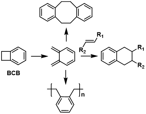 BCB,英文全称Benzocyclobutene,是一种重要的有机合成原料和苯并环丁烯树脂制备原料,具有优良的电学性能。其介电常数和介电损耗远低于目前热度较高的PSPI,环氧树脂、PPO等有机材料,在电子技术领域拥有广阔的应用前景。但是,网络上关于BCB的商业化报道甚少,主要原因有四:1)价格昂贵;2)制备条件苛刻;3)反应过程的副产物多;4)纯化困难。
