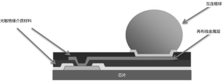 在集成电路先进封装中,光敏绝缘介质材料主要用在圆片级芯片封装(WLCSP)、扇出型圆片级封装、集成无源器件(IPD)圆片级封装上作为主要的介质材料,同时作为芯片的机械支撑材料。在圆片级封装结构中,晶圆表面的钝化层和晶圆信号排布的再布线层结构中的介质都需要通过光敏绝缘介质材料来制造。如下图所示为典型的圆片级封装模块的结构。在再布线层结构中,除可以作为再布线信号层的金属布线和凸点互连材料外,光敏绝缘介质材料是其中最主要的封装结构材料。